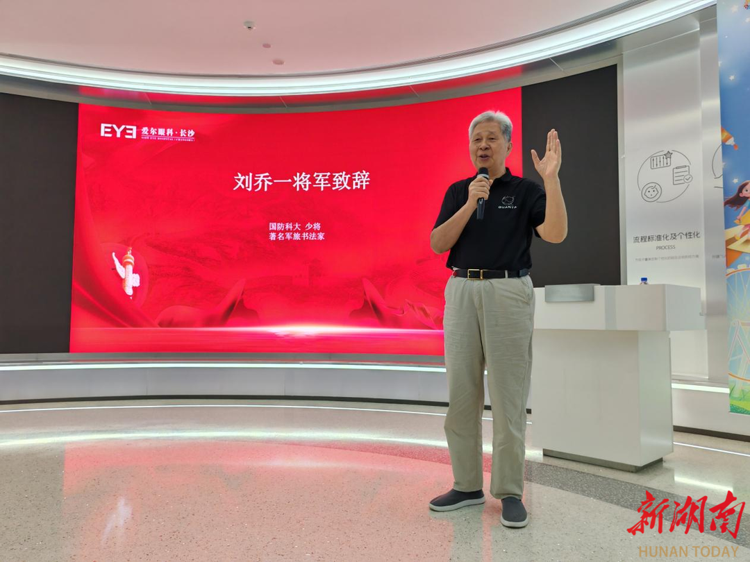 随后国防科大刘乔一将军发表致辞。他动情地表示,自己与爱尔眼科有着深厚渊源,多年来见证了医院的成长与担当,更要从三个维度为爱尔点赞。其一,肯定爱尔眼科的规模与发展:从区域医院到全球连锁,从技术引进到自主创新,爱尔眼科始终以专业实力引领眼健康行业发展,成为民生健康领域的“标杆力量”。其二,赞扬爱尔眼科的社会公益担当:无论是深入偏远山区开展眼健康公益筛查、科普进社区、校园,帮扶基层医疗机构等行动,爱尔始终把“社会效益”放在首位,用实际行动诠释了“医者仁心”的公益底色。其三,特别感谢陈邦董事长对退役老兵的深情关爱:陈邦董事长始终心系国防、情牵老兵,用企业担当为退役军人筑起“光明防线”,这种“拥军爱军”的情怀值得全社会学习。