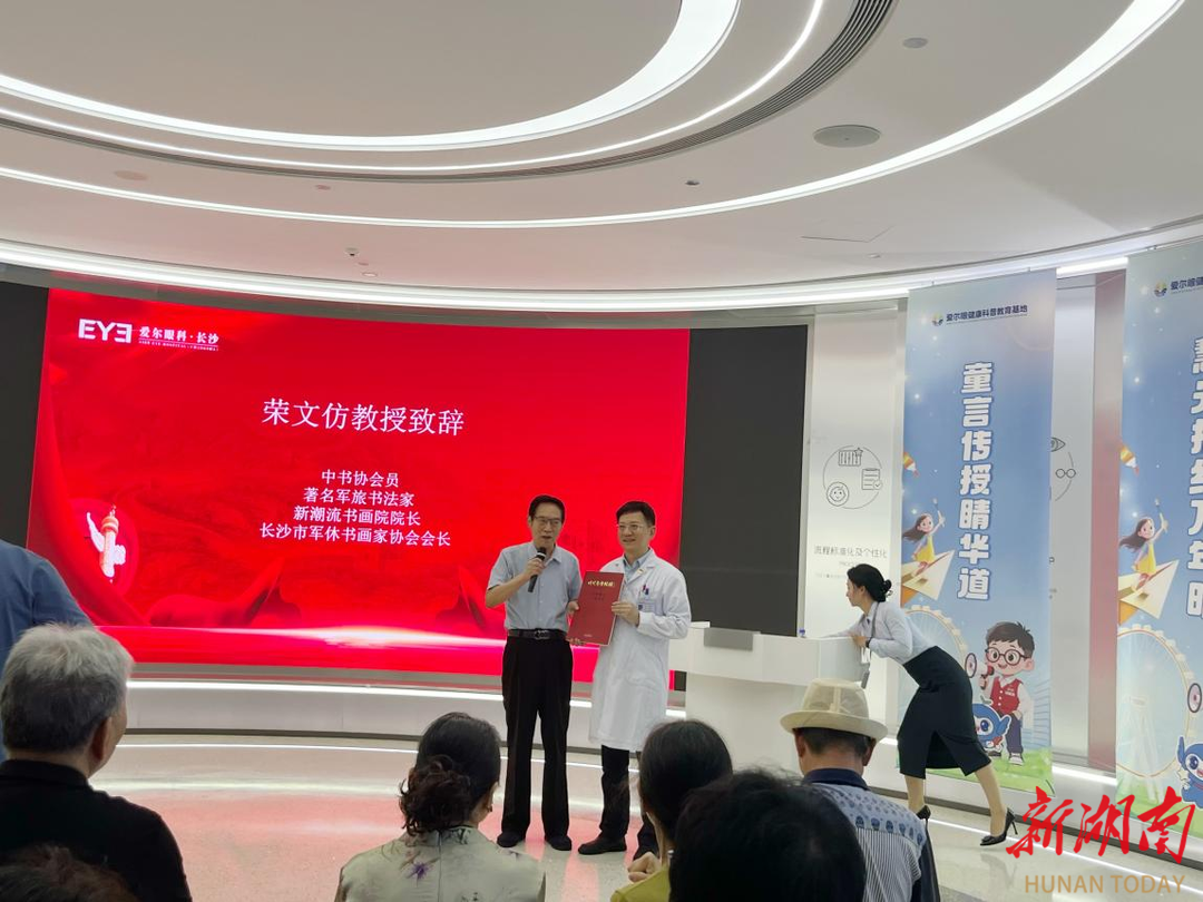 活动伊始,段宣初院长首先致辞。他指出,医术是守护生命健康的基石,艺术是滋养精神世界的养分,正是长沙爱尔眼科医院探索“艺术与医术相结合”的生动实践。他强调,长沙爱尔眼科医院始终以“使所有人,无论贫穷富裕,都享有眼健康的权利”为使命,在为百姓守护光明的同时,也始终牢记党建引领的责任担当——我们通过开展眼健康公益筛查、科普进社区、帮扶基层医疗机构等行动,让党员的初心在服务中扎根;今天这场活动,更将“书画艺术的文化之美”与“眼健康的守护之责”紧密结合,既是对祖国华诞的深情献礼,更是对“以人民为中心”理念的生动践行。