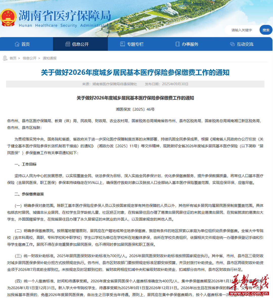 湖南省医保局发布《关于做好2026年度城乡居民基本医疗保险参保缴费工作的通知》 网页截图