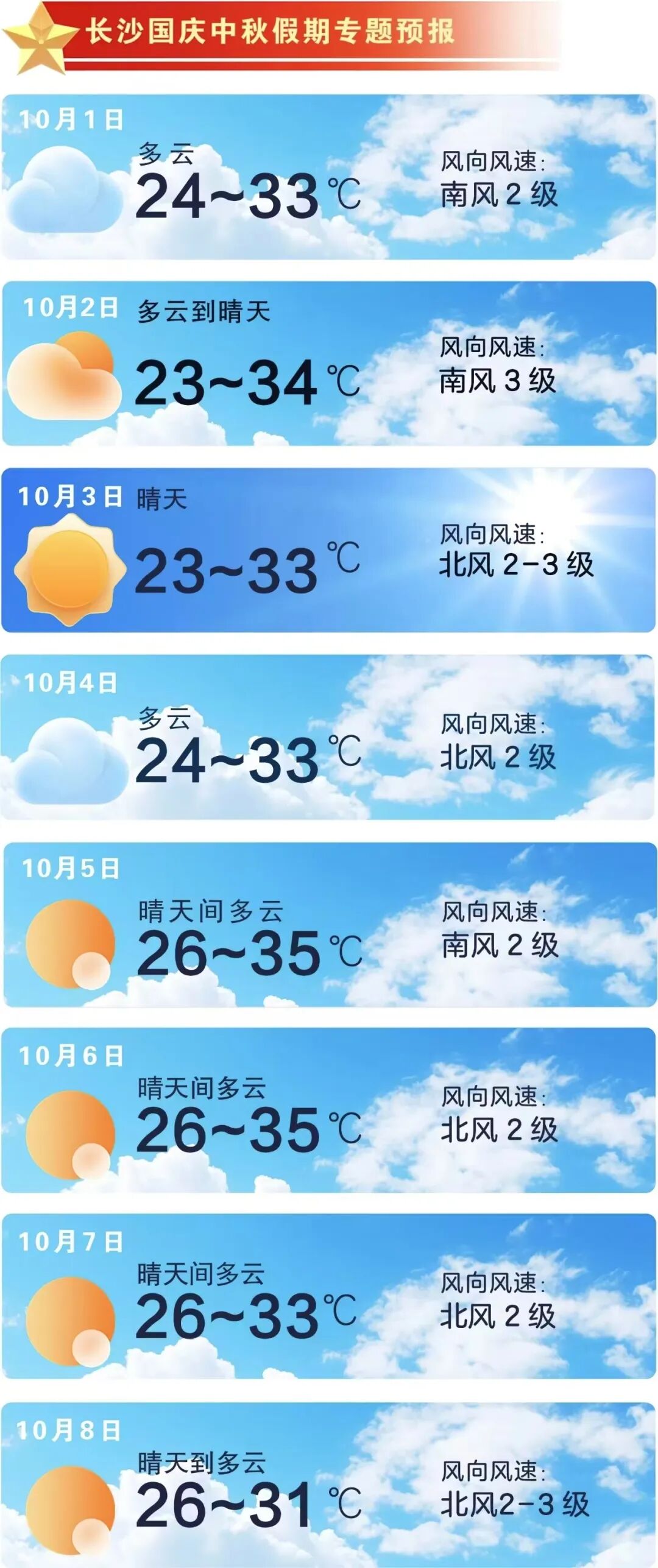 10月1日晚上至2日白天,全省多云间晴天,湘西北部分地区有阵雨;2日清晨湘西局地有雾;南风2~3级;最高气温湘西北26~30℃,其他地区31~35℃,最低气温22~25℃。