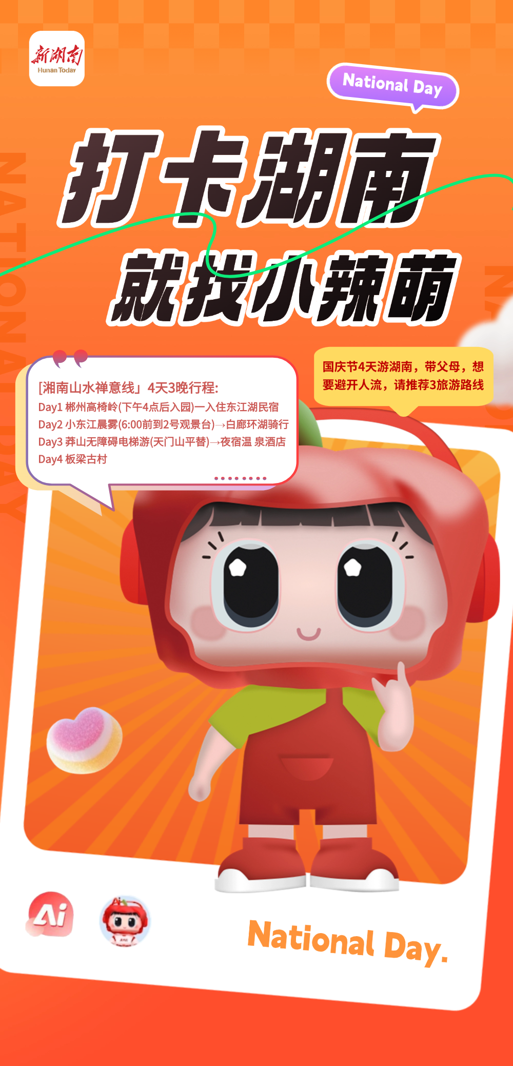 “双节来湖南玩?找我小辣萌就对啦!”打开新湖南APP,点击首页下方“小辣萌”按钮就能召唤AI小伙伴,不用翻遍全网查攻略,小辣萌就能陪你畅玩湖湘!
