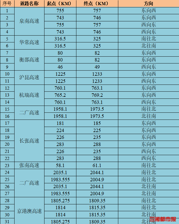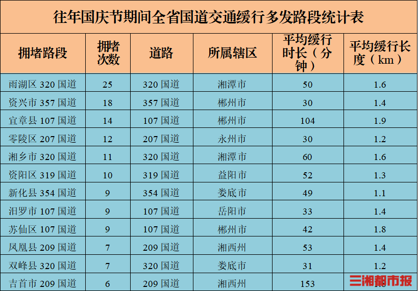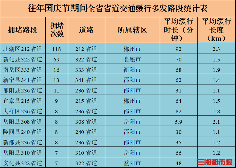 省道方面,缓行较多的有:北湖区S212省道、新化县S322省道、南岳县S333省道、新宁县S341省道、邵阳县S236省道。从通行辖区看,郴州辖区137次、娄底辖区78次、邵阳辖区63次、衡阳辖区19次,共占比83.9%。