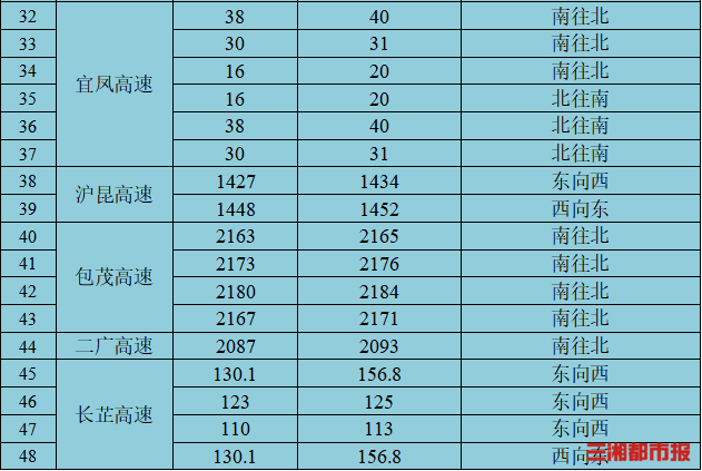 主要缓行路段为:京港澳高速长沙、株洲、衡阳、郴州段,许广高速湘潭、衡阳、郴州段,沪昆高速湘潭、邵阳段,长张高速益阳、长沙段。主要缓行原因为:车流量大、刮擦事故多、长上坡、隧道群、服务区饱和等。流向特点为:以西往东、南往北方向为主。