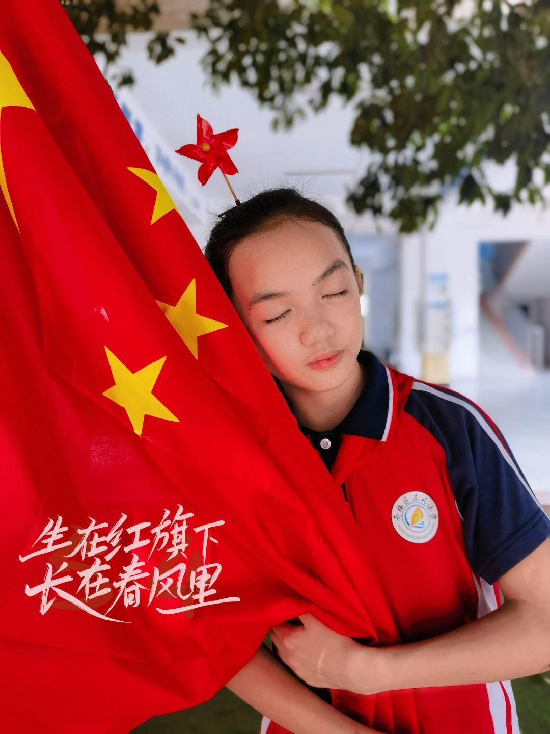 活动中,东风学子们身着校服,或在校园绿荫下、或在操场跑道旁,与鲜艳的五星红旗亲密合影。他们有的手持小国旗,脸上贴着国旗贴纸,笑容灿烂;有的以手比心,将对祖国的热爱定格在镜头中;还有的模仿升旗仪式,庄重敬礼,展现出新时代少年的精神风貌。每一张照片都传递着“生在红旗下,长在春风里”的幸福感,每一个画面都诉说着“愿以少年志,护我盛世中华”的坚定信念。