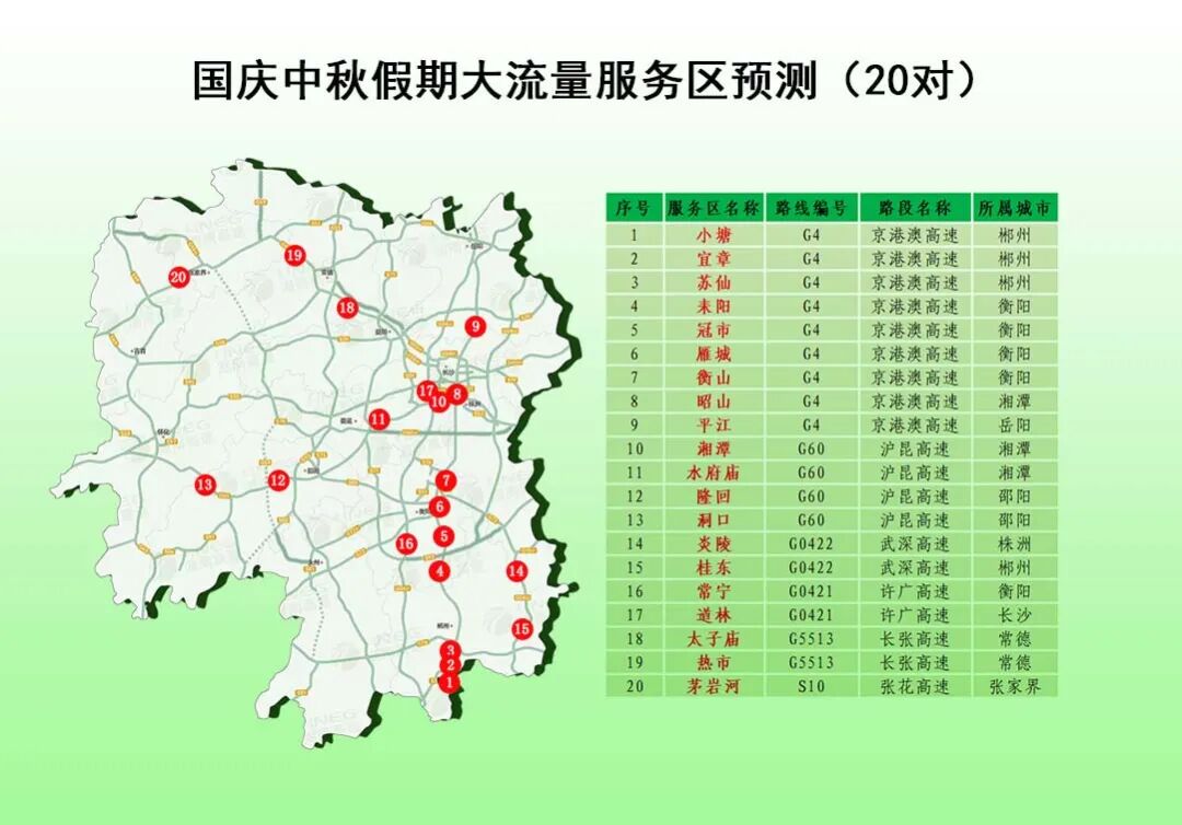 预测国庆中秋假期,服务区车流客流增幅较大,“潮汐”拥堵特征明显,充电设施设备利用率高,繁忙的服务区有: