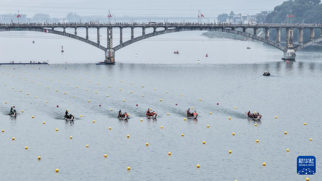 9月30日,在广西柳州市融安县迎国庆龙舟大赛中,参赛队伍在比赛中(无人机照片)。