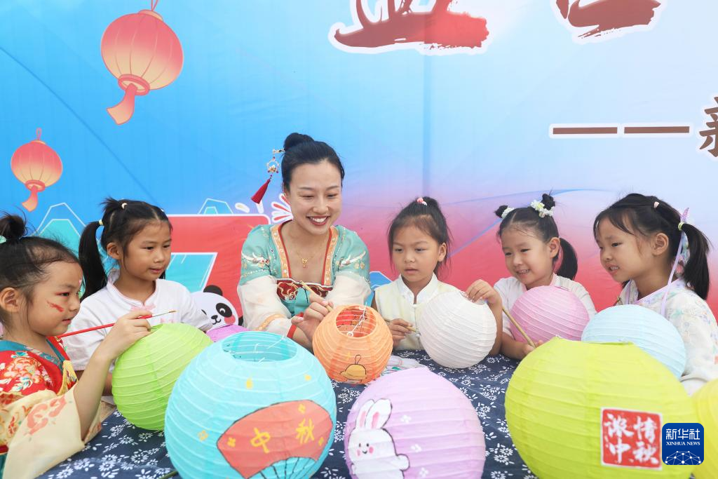9月29日,河北省唐山市丰润区新城道幼儿园举行的“花好月圆古韵迎中秋”主题活动中,小朋友在老师的指导下学习彩绘灯笼。
