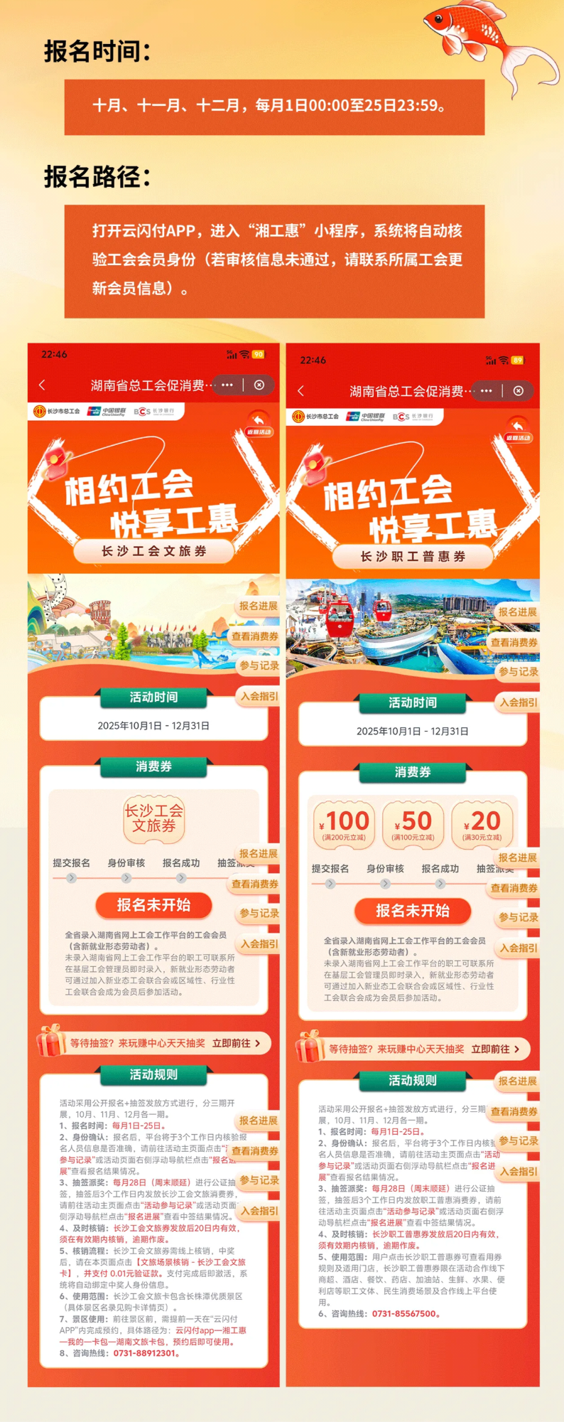 据介绍,活动报名时间为2025年10月至12月每月1日00:00至25日23:59。每月28日摇号(周末顺延)公布中奖结果。工会文旅券、职工普惠券须在20日内核销使用。