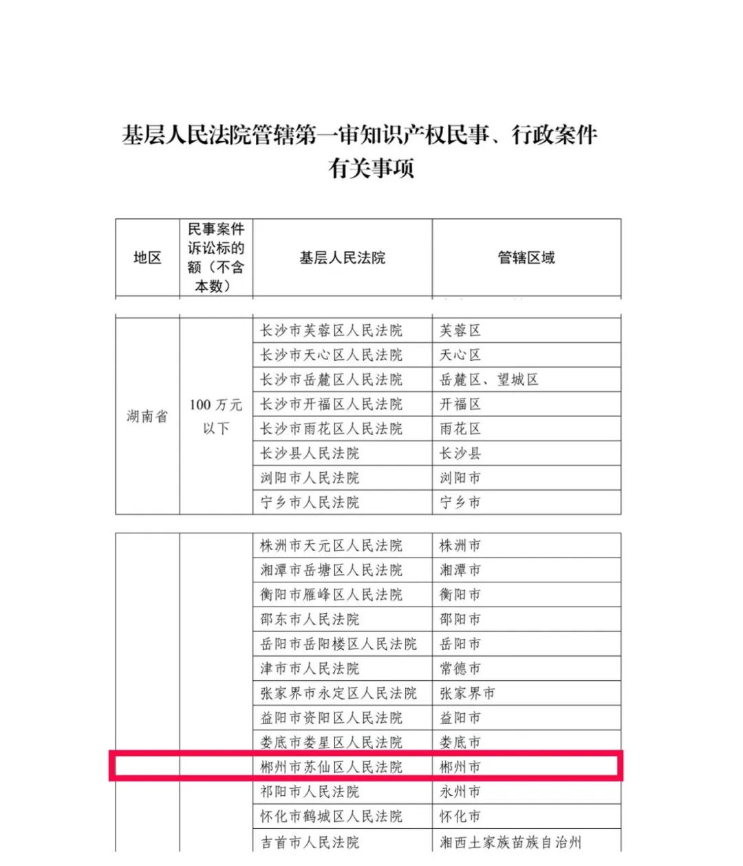 根据《通知》明确规定,由郴州市苏仙区人民法院管辖郴州市范围内诉讼标的100万元以下的第一审知识产权民事、行政案件。