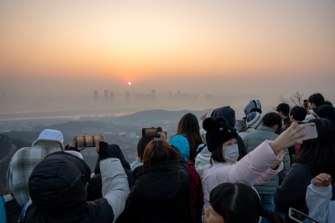 众多游客来到长沙岳麓山登高观日出。张敏 摄