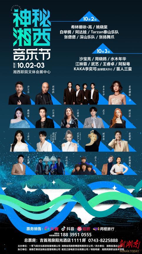 天籁低语、铜铃颤动,古老土家族苗族神秘非遗与史诗级潮汕英歌舞的历史碰撞,闯入现代电音狂欢现场。届时,现场更有明星阵容:白举纲的硬核摇滚、希林娜依·高的天籁唱响,沙宝亮的经典传奇、水木年华的青春时代、姚晓棠的超强唱功,还有周晓鸥、武艺、江映蓉、Tarzan泰山乐队、KAKA李奕可等一众实力唱将与乐队探秘湘西。用音乐舞台,来一场与神秘湘西文化的精彩共振。