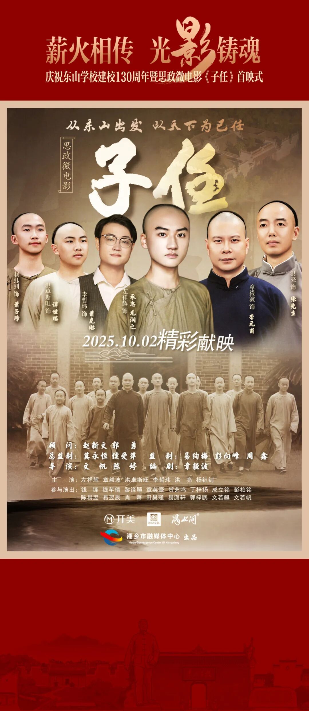 为庆祝东山学校建校130周年,由湘乡市融媒体中心、东山学校、湘乡市文化旅游发展有限公司联合摄制的思政微电影《子任》将于10月2日在东山学校首次亮相 。这既是对东山学校光荣历史的回望,更是对红色精神的传承,对思政教育新路径的探索。