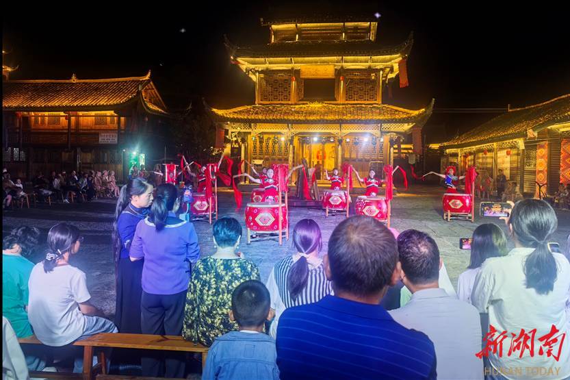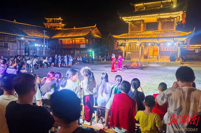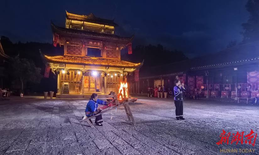新湖南客户端10月2日讯(通讯员 周金标)10月1日晚,湘西土家族苗族自治州龙山县惹巴拉景区在小摆手堂前点燃篝火,以一场热烈淳朴的非遗演出,迎接八方游客。熊熊火光映照着土家村寨的夜空,也点亮了游客对民族文化的深度体验。