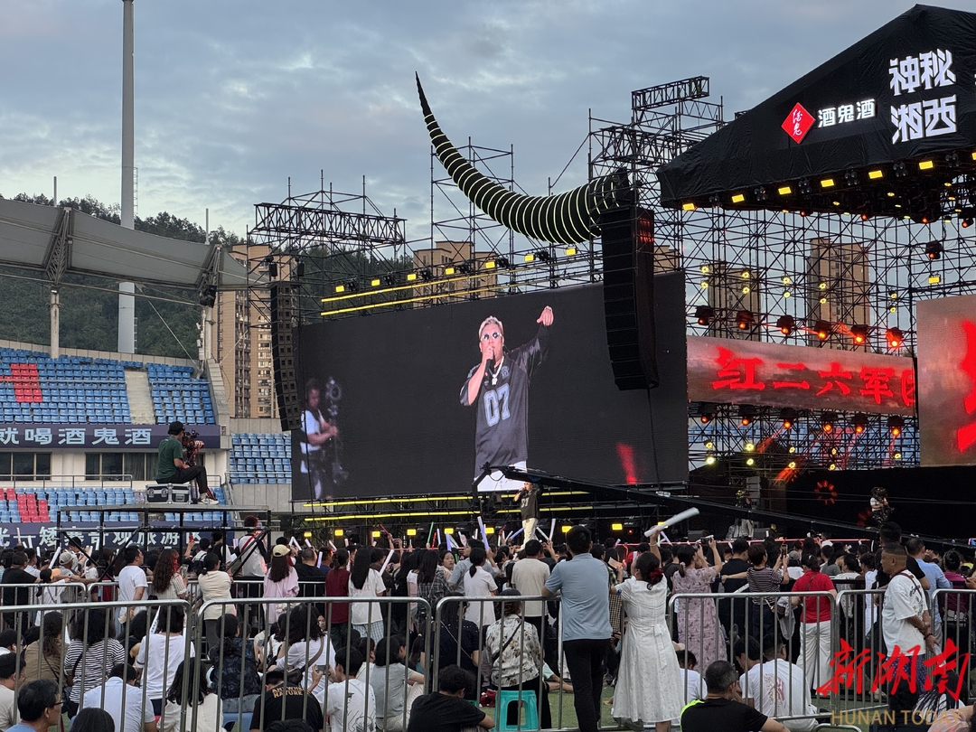 留着络腮胡子的深山乐队主唱,用粗犷的苗音演唱《 一眸十年》《湘西姑娘》,张明松深情演唱《湘西美》《吕洞山神话》,让现场观众如痴如醉。古老土家族和苗族的神秘非遗,闯入现代电音狂欢现场。白举纲的硬核摇滚、姚晓棠的温柔低语、希林娜依·高的天籁唱响……一众实力唱将与乐队探秘湘西。用音乐舞台,与神秘湘西文化精彩共振。大家跟随音乐节奏挥舞手中的荧光棒,台下声浪如山呼海啸。