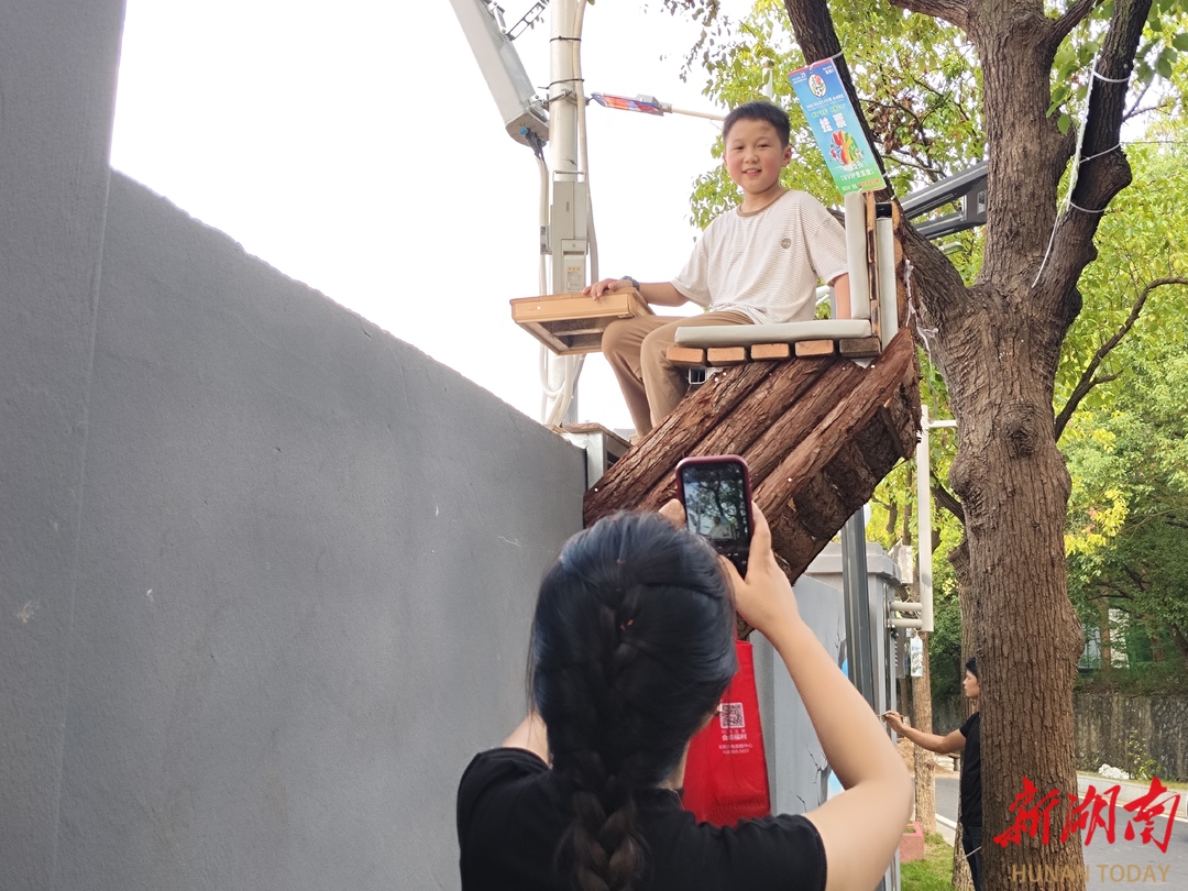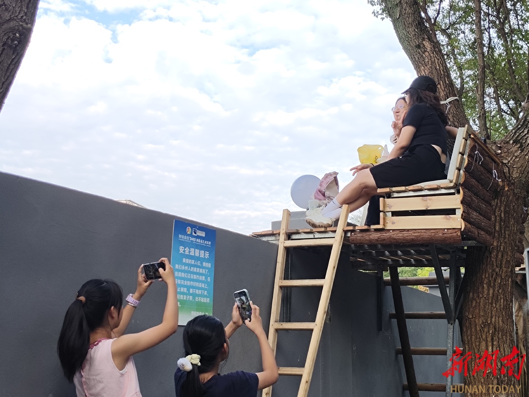 “湘超”永州主场球票“秒光”,举办方回应球迷建议,创新推出在树上观赛的“挂票”。国庆小长假期间,永州市体育场“挂票”区成为网红打卡点。图为10月2日,游客在永州市体育场“挂票区”体验、留影。(湖南日报全媒体记者 刘跃兵 摄)