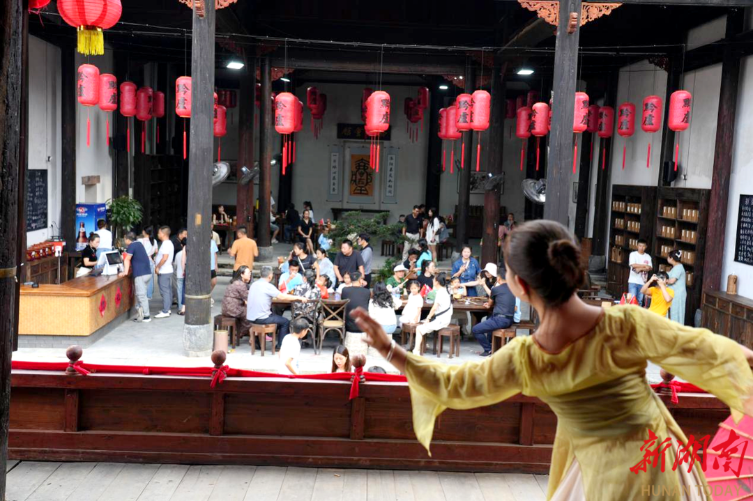 走入黔阳古城,城内的黔庐会馆更是人气聚集地。游客们手捧特色小吃围坐其间,一边品尝地道风味,一边欣赏民族舞蹈、京剧、乐器演奏等民俗文化表演。“假期游客量较平常翻了三番。”黔庐会馆负责人郑臣君介绍。