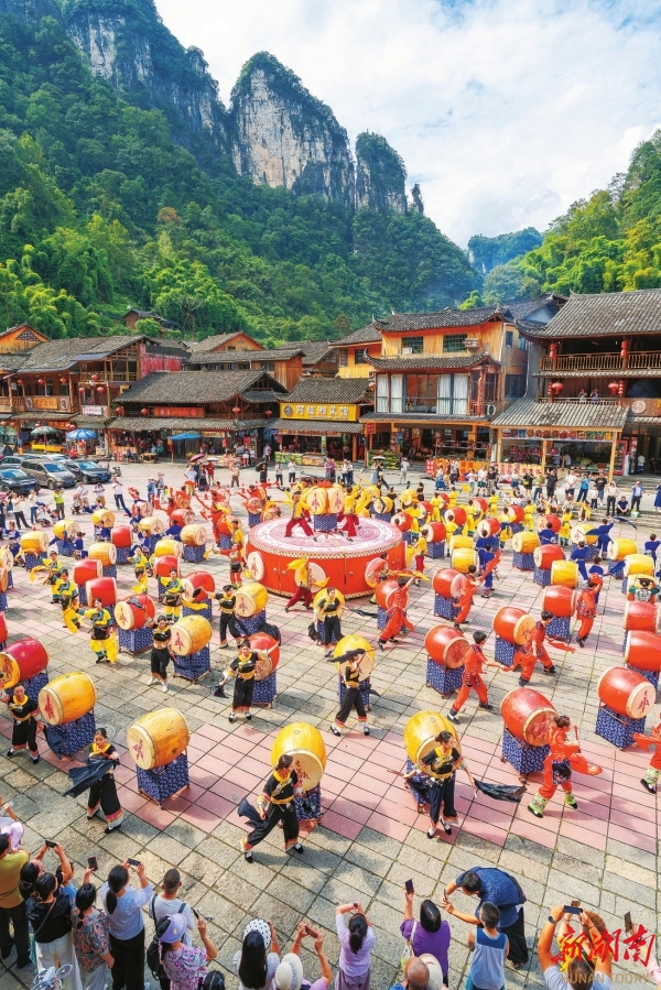 10月2日,吉首市矮寨镇德夯苗寨景区,百余名身着苗族盛装的鼓手同台齐奏,开展“百鼓齐鸣庆国庆”主题活动,吸引众多游客驻足观赏、参与体验。梁永鸿 彭丽 摄影报道(湖南图片库)