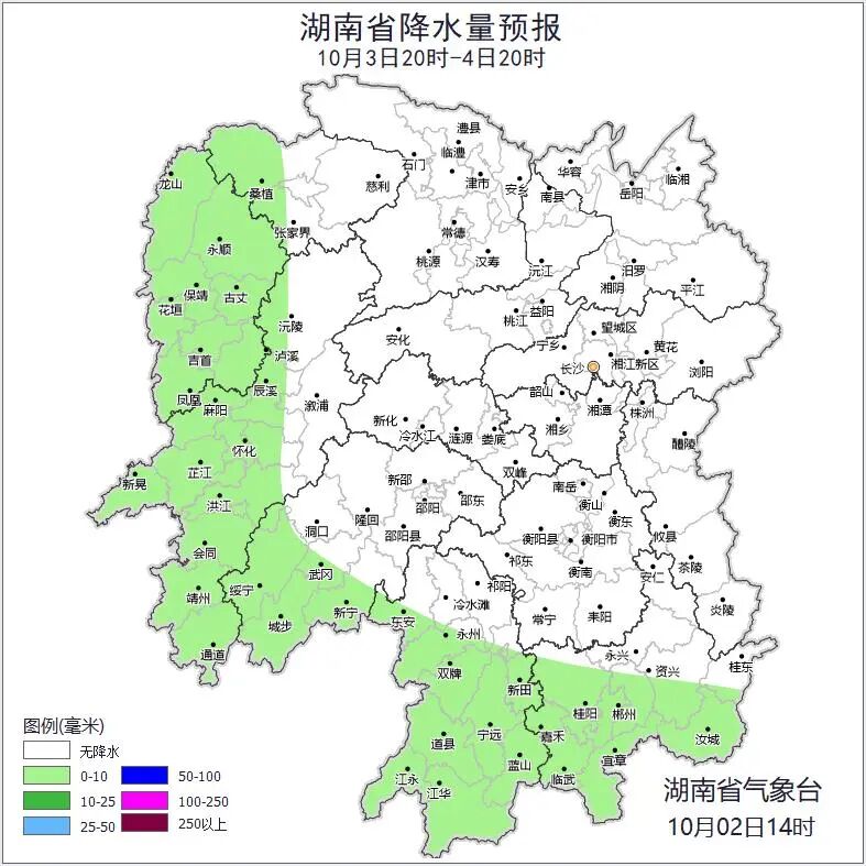 10月3日晚上至4日白天,多云间晴天,湘西、湘南部分地区有阵雨或雷阵雨;湘中以北北风2~3级,其他地区南风2~3级;最高气温湘西、湘北27~32℃,其他地区33~35℃,最低气温19~24℃。