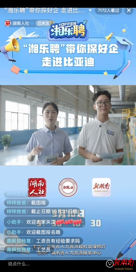 事实上,比亚迪并非个例。今年以来,“湘乐聘”已先后走进金杯电缆、京东物流、梦洁家纺等省内知名企业开展直播带岗,10月下旬,还将走进水羊股份,持续为企业与求职者搭建对接平台。