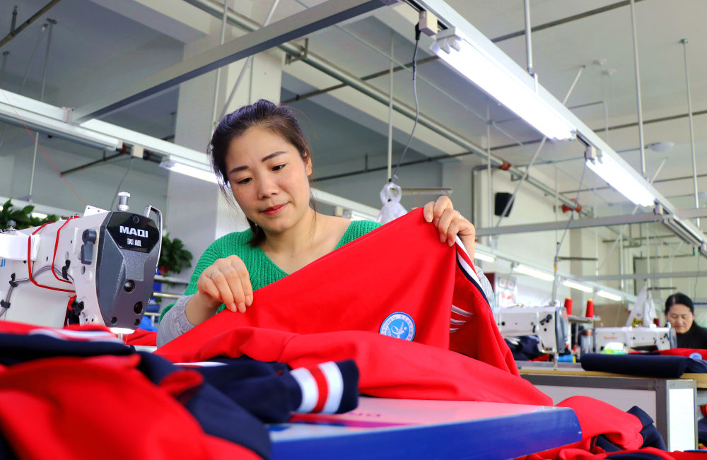 ↑ 10月2日,工人在甘肃省平凉市静宁县城关镇南关村乡村就业帮扶车间赶制服装订单。新华社发(王毅 摄)