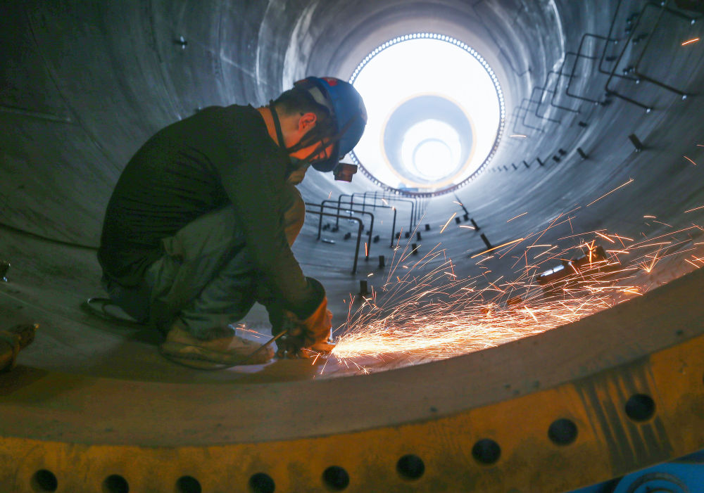 ↑ 10月2日,工人在江苏连云港经济技术开发区一家风电设备公司车间内生产风电塔架。新华社发(王健民 摄)