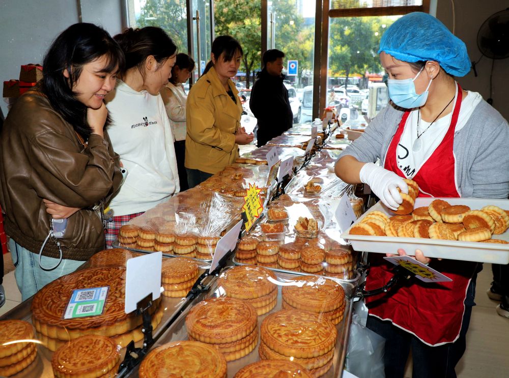 ↑ 10月2日,工人在河南省南阳市区一家传统纯手工月饼作坊向消费者介绍月饼品种。新华社发(高嵩 摄)