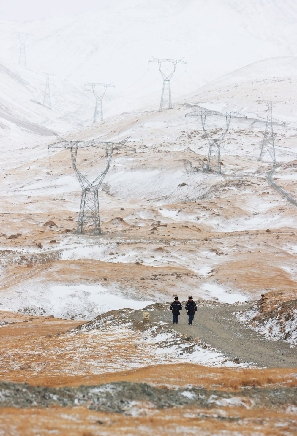 ↑ 10月2日,在新疆巴音郭楞蒙古自治州和静县巴音布鲁克草原,新疆送变电有限公司员工在巡视750千伏伊犁—库车输电线路。新华社发(张利民 摄)