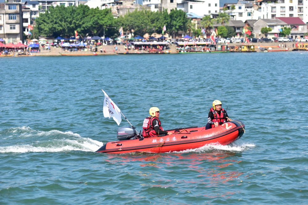 ↑ 10月2日,广西壮族自治区融安县应急管理工作人员在融江龙舟比赛水域巡逻。新华社发(廖祖平 摄)
