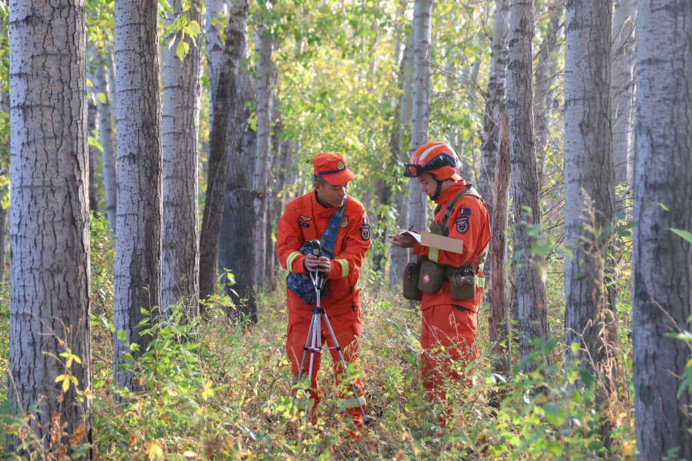 ↑ 10月2日,黑龙江省森林消防总队哈尔滨市支队特勤大队的消防员在哈尔滨市松北区测量林区风力、湿度和可燃物载量。新华社发(杨铁岩摄)