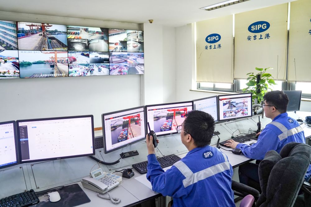↑ 10月2日,浙江湖州安吉上港国际港集装箱码头中控室工作人员在实施整体调度,保障调度与装运高效运转。新华社发(潘学康摄)