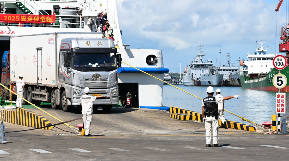 ↑ 10月2日,工作人员在海南省海口市秀英港引导货车有序驶离客滚船。新华社记者 杨冠宇 摄