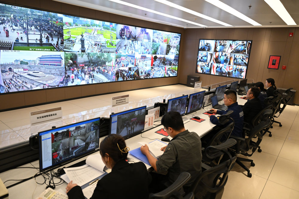 ↑ 10月2日,西安城墙管委会信息中心的工作人员通过西安城墙数字方舱综合管理平台监看景区实况。新华社记者 李一博 摄