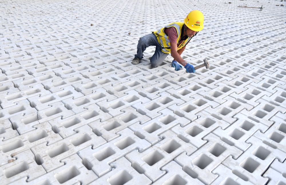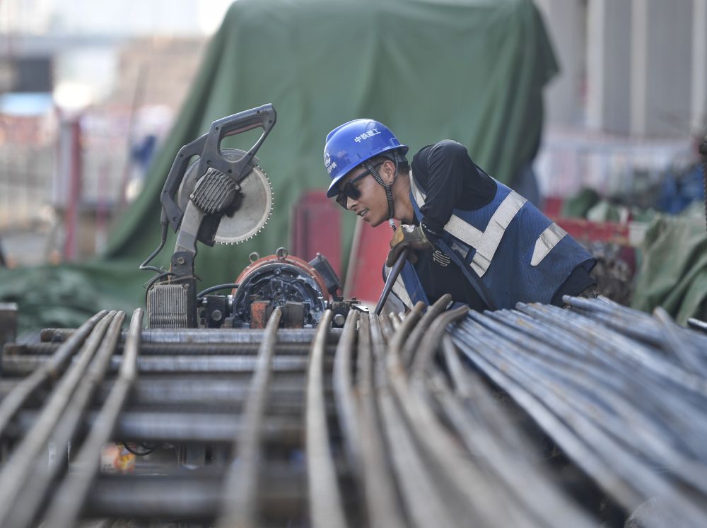 ↑ 10月2日,中铁二十局的建设者在甘肃省白银市高新区综合管网及市政配套设施项目施工现场进行制梁作业。新华社记者 陈斌 摄