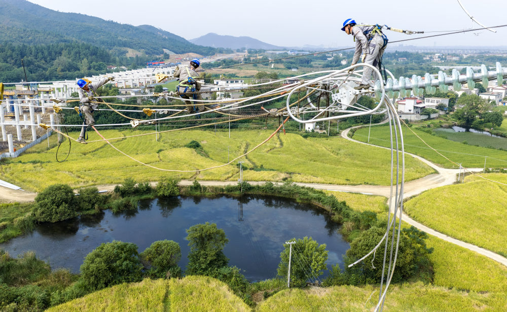 ↑ 10月2日,安徽送变电工程有限公司施工人员在位于安庆市怀宁县的S22安潜段天天高速500千伏双余/余文线迁改工程现场作业(无人机照片)。新华社发(郑贤列 摄)