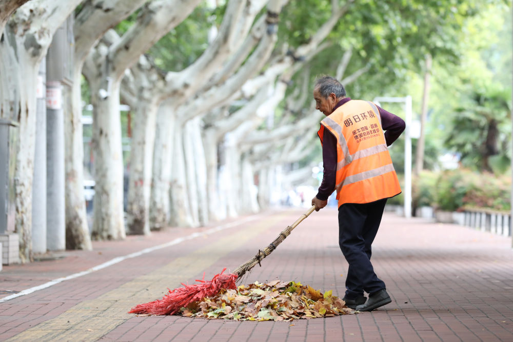 ↑ 10月2日,一名环卫工人在河南省焦作市温县街头清扫落叶。新华社发(徐宏星 摄)