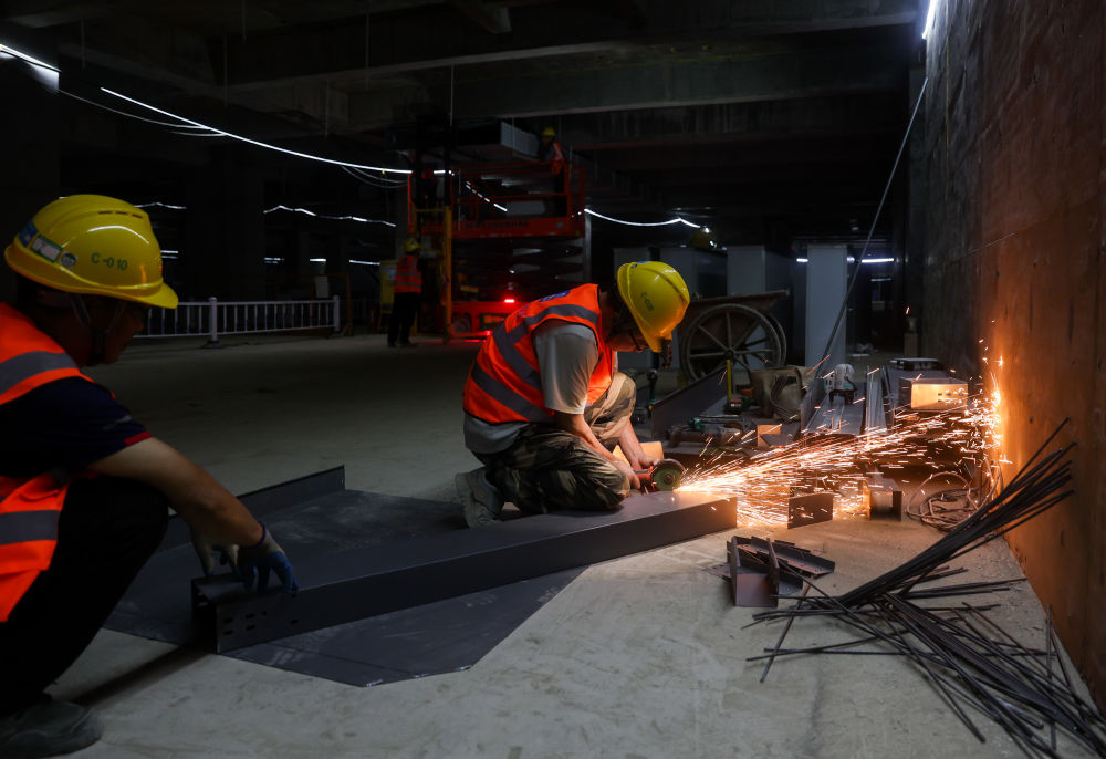 ↑ 10月2日,中铁建工集团的施工人员在四川成都车站扩能改造站房项目施工现场作业。新华社记者 刘坤 摄