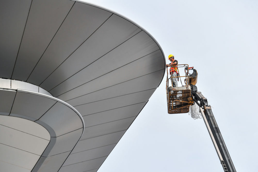 ↑ 10月2日,在湖南长沙机场改扩建工程T3航站楼施工现场,中建五局不二幕墙公司工人在安装吊顶胶条。新华社记者 陈思汗 摄
