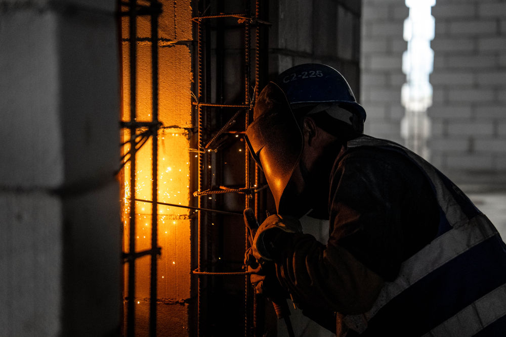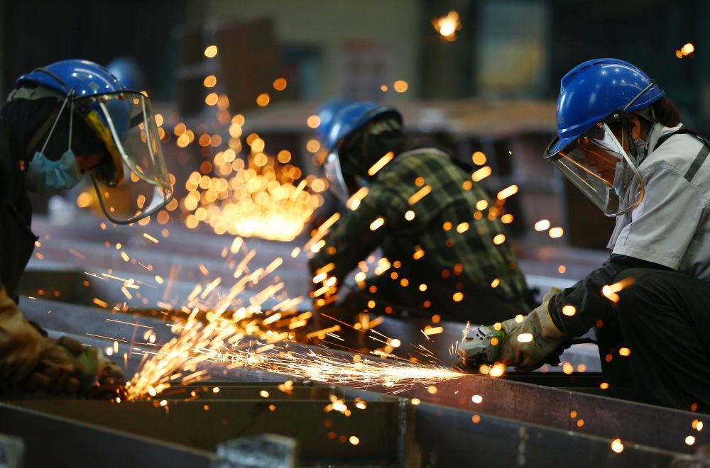 ↑ 10月2日,工人在山东省滕州市三维重工有限公司生产车间打磨钢构件。新华社发(李志军摄)