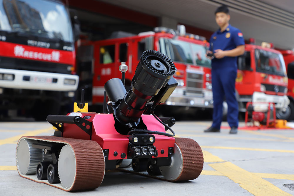 ↑ 10月2日,在福建省厦门市思明区厦禾消防救援站,消防员在检查测试便携式小型灭火机器人的性能。新华社发(曾德猛 摄)