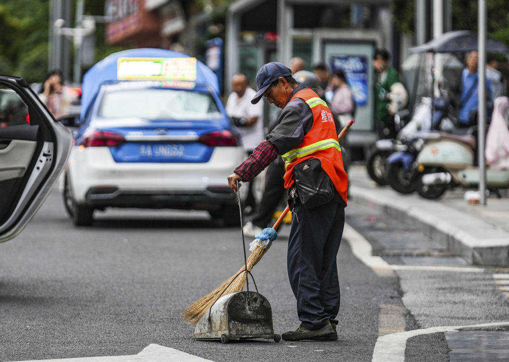 ↑ 10月2日,环卫工人在贵州省贵阳市云岩区尚礼路清扫路面。新华社记者 陶亮 摄
