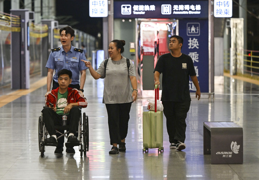 ↑ 10月1日,客运员值班员在广西南宁东站护送一名重点旅客提前乘车。新华社记者 张爱林 摄