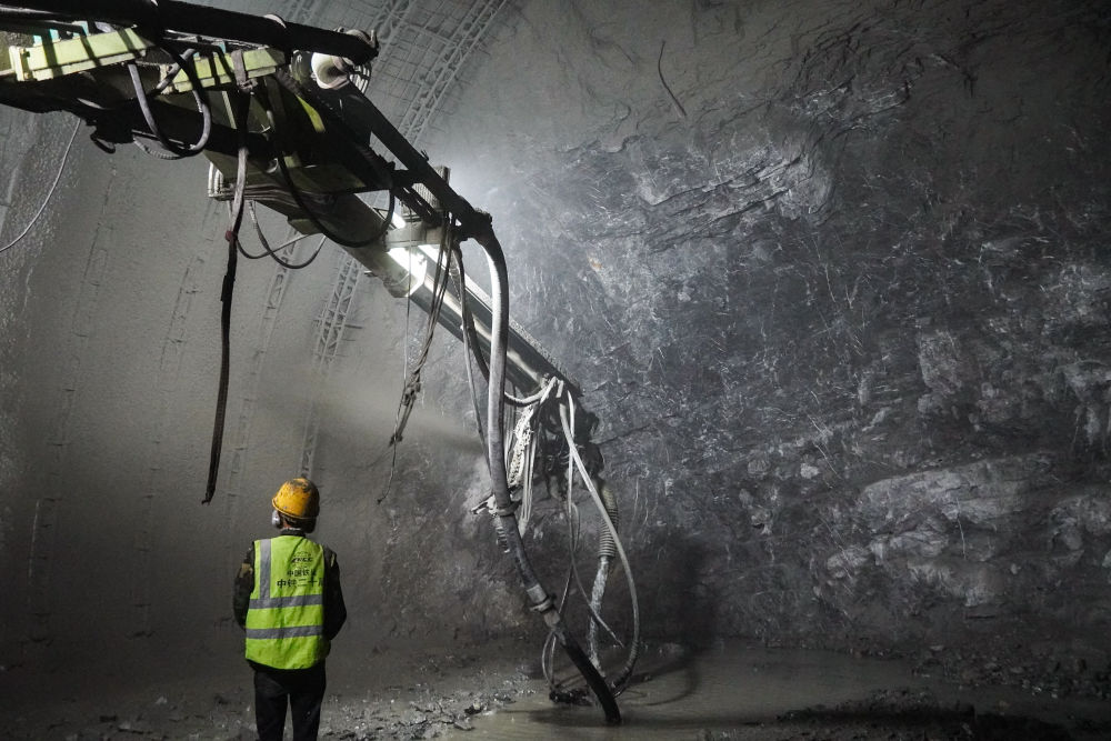 ↑ 10月2日,中铁二十局的建设者在西渝高铁向阳二号隧道出口进行隧道初期支护喷射砼作业。新华社记者 王曦 摄