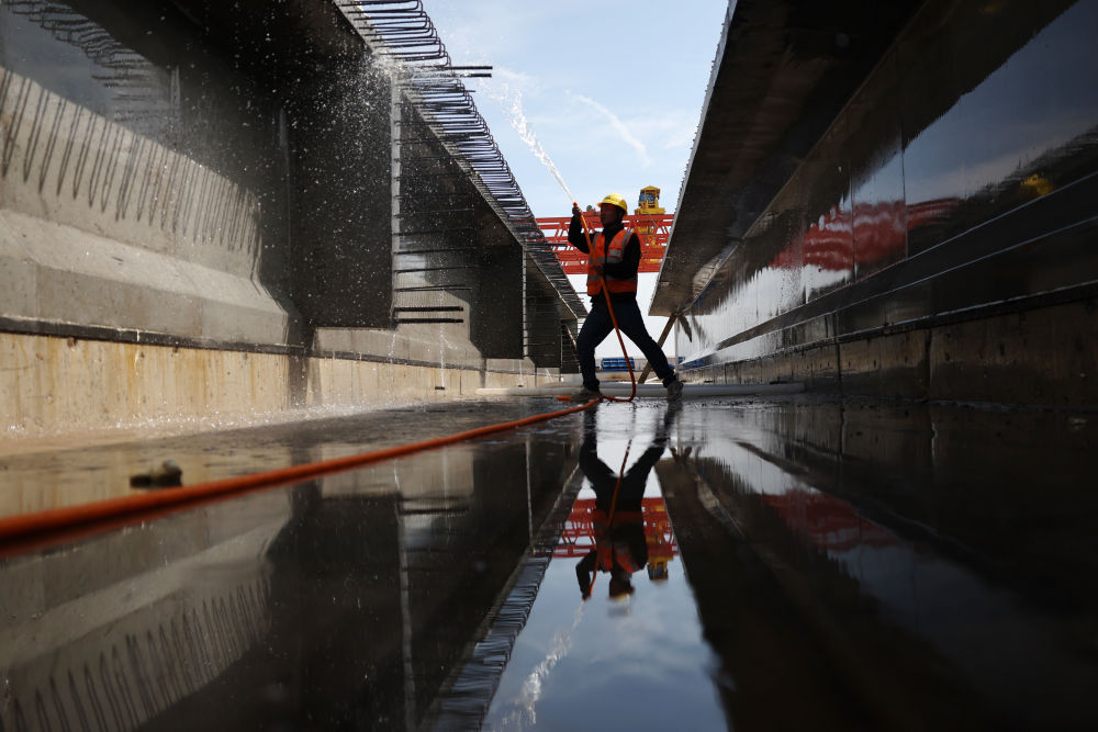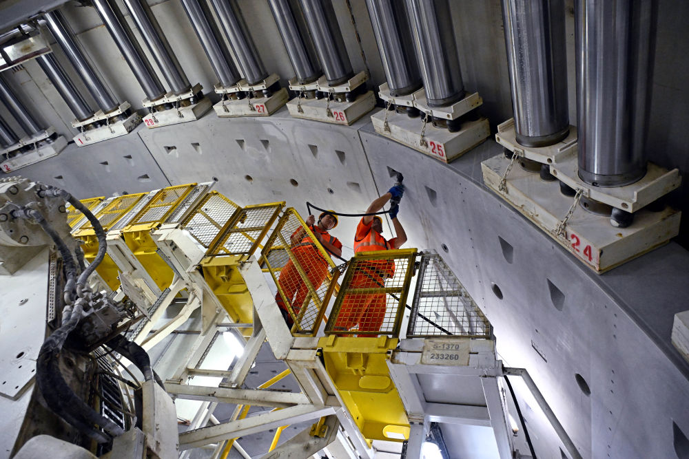 ↑ 10月2日,中铁十四局建设者在山东青岛胶州湾第二隧道工程建设现场施工作业。新华社记者 李紫恒 摄