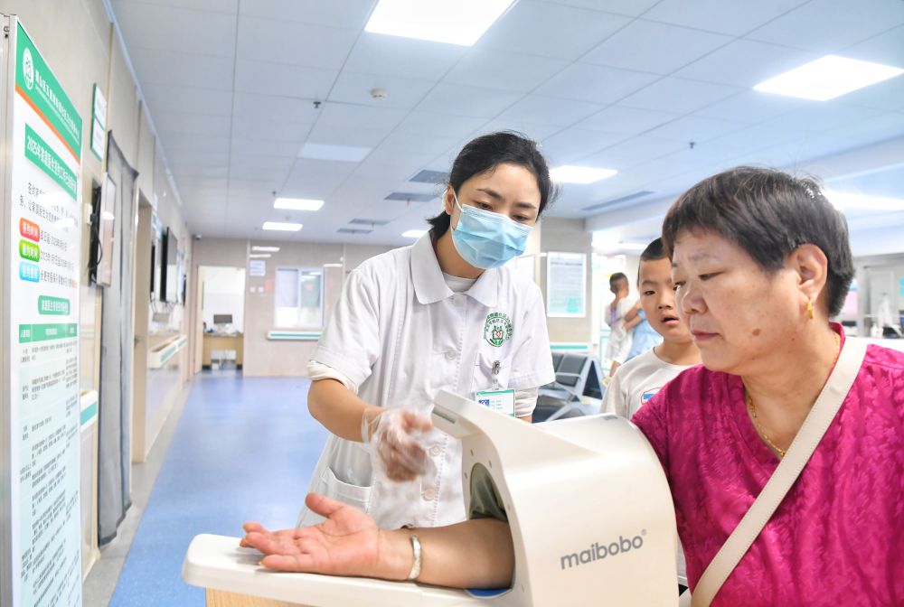 ↑ 10月2日,安徽省合肥市蜀山区五里墩街道社区卫生服务中心医护人员在指导居民测量血压。新华社发(陈三虎 摄)