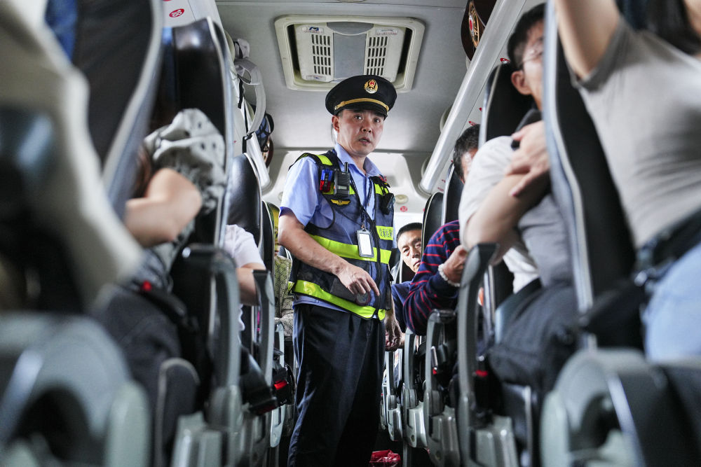 ↑ 10月2日,在重庆北碚汽车客运中心,交通执法北碚区大队执法人员在车内巡查。新华社发(秦廷富 摄)