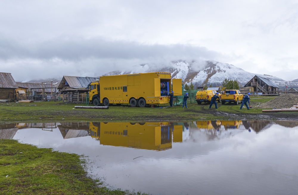 ↑ 10月2日,在新疆阿勒泰地区喀纳斯景区,国网新疆阿勒泰供电公司员工调试连接中压发电车。新华社发(努尔别克·努尔曼 摄)