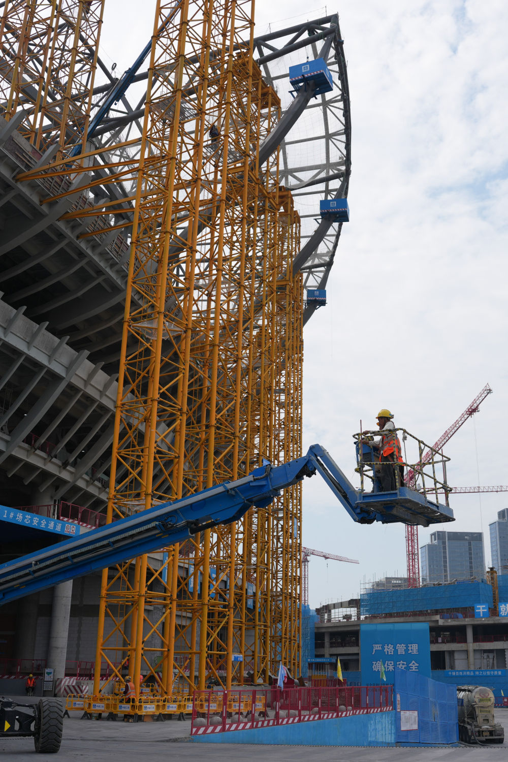 ↑ 10月2日,中建三局建设者在浙江省杭州市余杭国际体育中心项目现场施工作业。新华社记者 黄宗治 摄