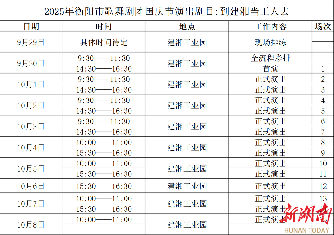 湖南日报·新湖南客户端10月3日讯(记者 唐曦)记者今天从衡阳市文旅广体局获悉,10月4日至8日,由衡阳市歌舞剧团进湘见·建湘工业文化街区演绎的《到建湘当工人去》剧目,演出时间由原定的上午9:30-11:30改为上午10:00-11:00、下午2:30-4:30改为下午3:30-4:30。