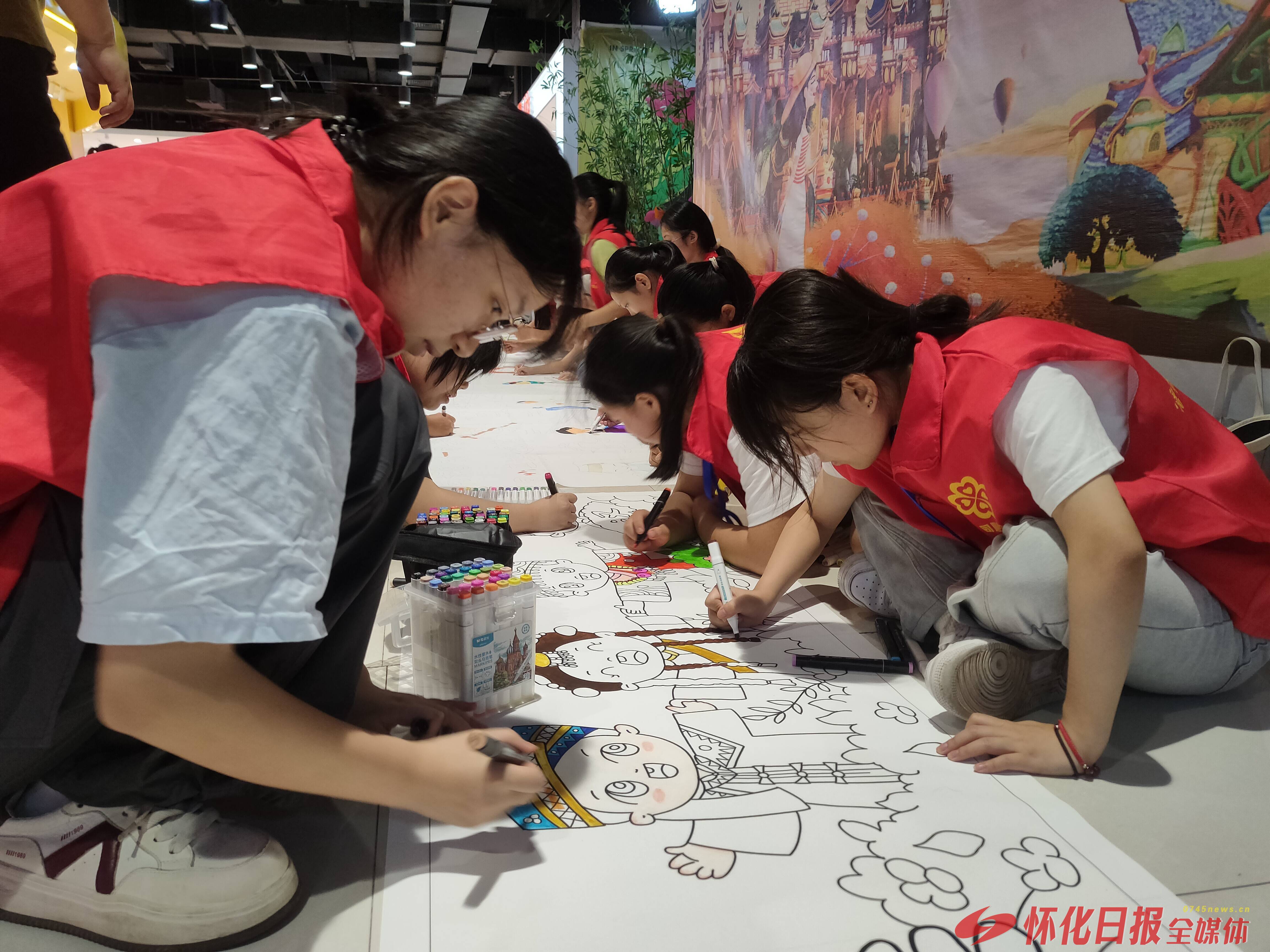 在通程广场二楼活动现场,百米画布沿场地铺开,各色颜料、画笔整齐排列。各族青少年围坐画布旁,迅速投入创作:有的弯腰勾勒56个民族人物手拉手的轮廓,有的蘸取色彩填充象征团结的石榴图案,有的在画面角落添画侗族鼓楼、苗族银饰等民族元素。大家分工协作、默契十足,画布上的图案随时间推移逐渐变得丰富鲜活。