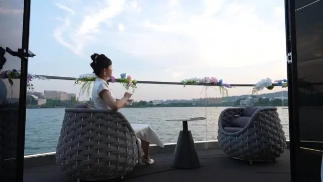 夕阳落在岳麓山身后时,船身映着粉色晚霞,耳边是湖畔民谣,手中捧着后湖本地品牌的甜点,随手拍都是“氛围感大片”;最大的“水上会客厅”成了家庭聚会、朋友小聚的首选,纯电动驱动的平稳感让长辈也能安心享受“湖上慢时光”。